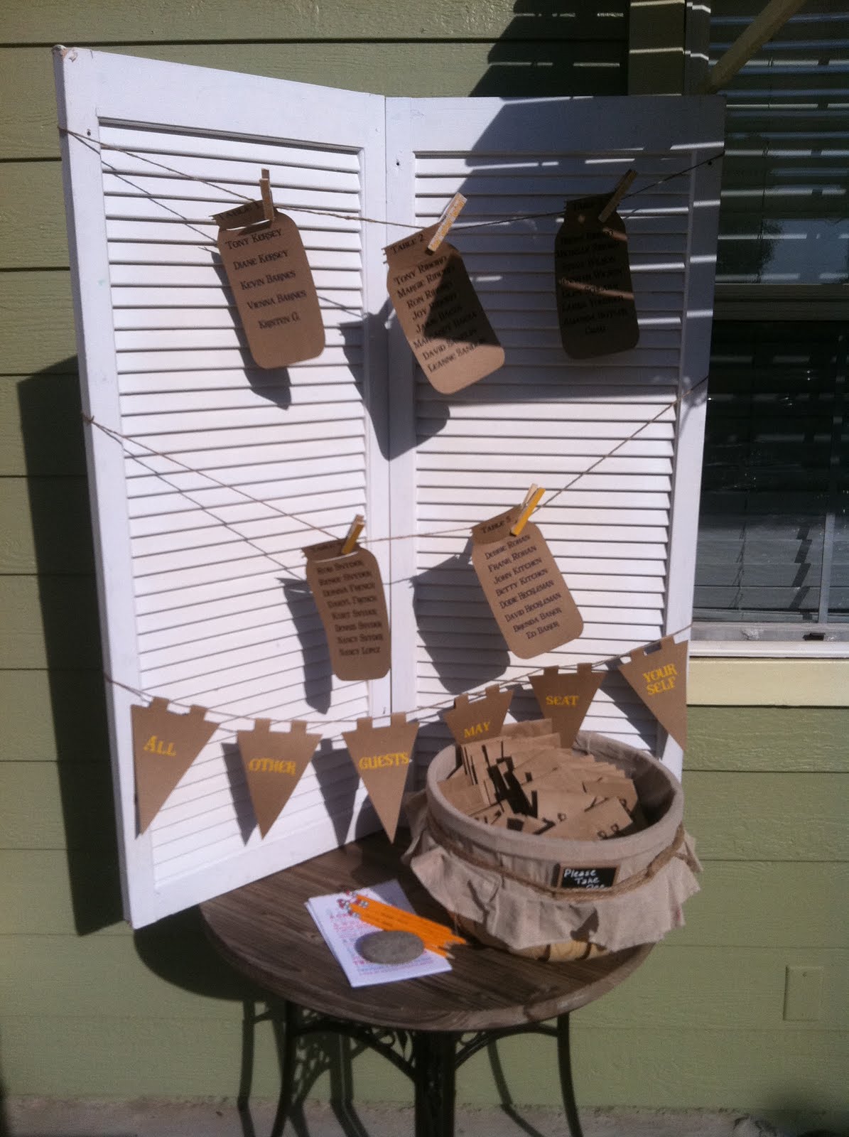 I used shutters for the seating chart. I hinged them together and made banners to string across.